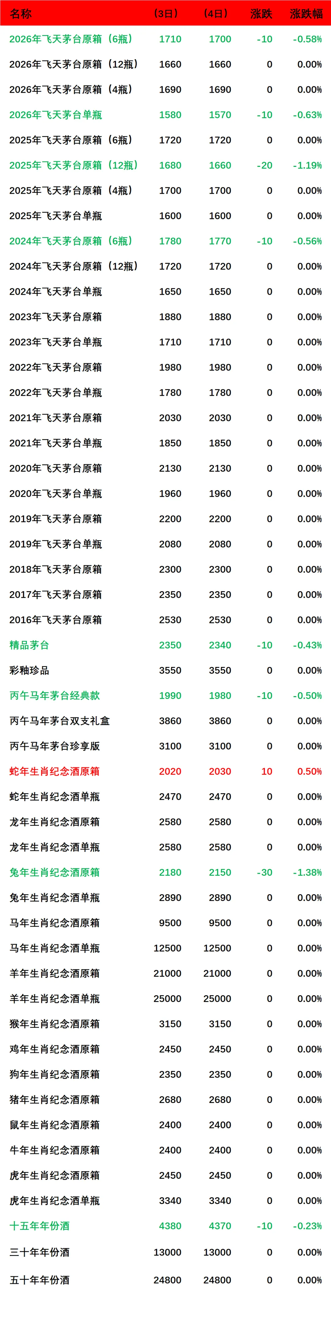 2026年飞天茅台原箱(6瓶)和单瓶,2025年飞天茅台原箱(12瓶(,2024年飞天茅台原箱(6瓶),精品茅台,十五年年份酒,丙午马年经典款和兔年生肖纪念酒原箱下跌;