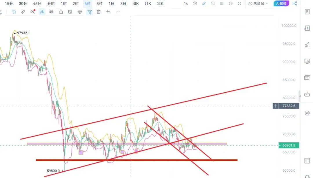 1小时:66500–67500 窄幅磨盘,上攻乏力