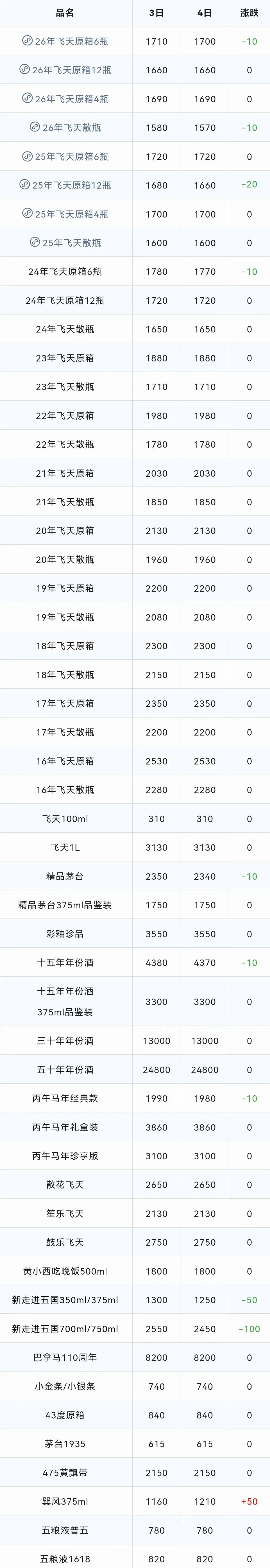 由于公众号平台修改了推送规则,如果不想错过“茅酒顾问”行情价,记得读完点一下“在看”,这样每次新文章推送才会第一时间出现在你的订阅列表里。今日(4月4日),从茅酒顾问发布的白酒价格行情监测数据显示,近段时间整箱茅台价格一直在1550徘徊,散瓶在1540左右,今日53度贵州飞天茅台(500ml)一批价跌至1700元左右!散飞在1570。
