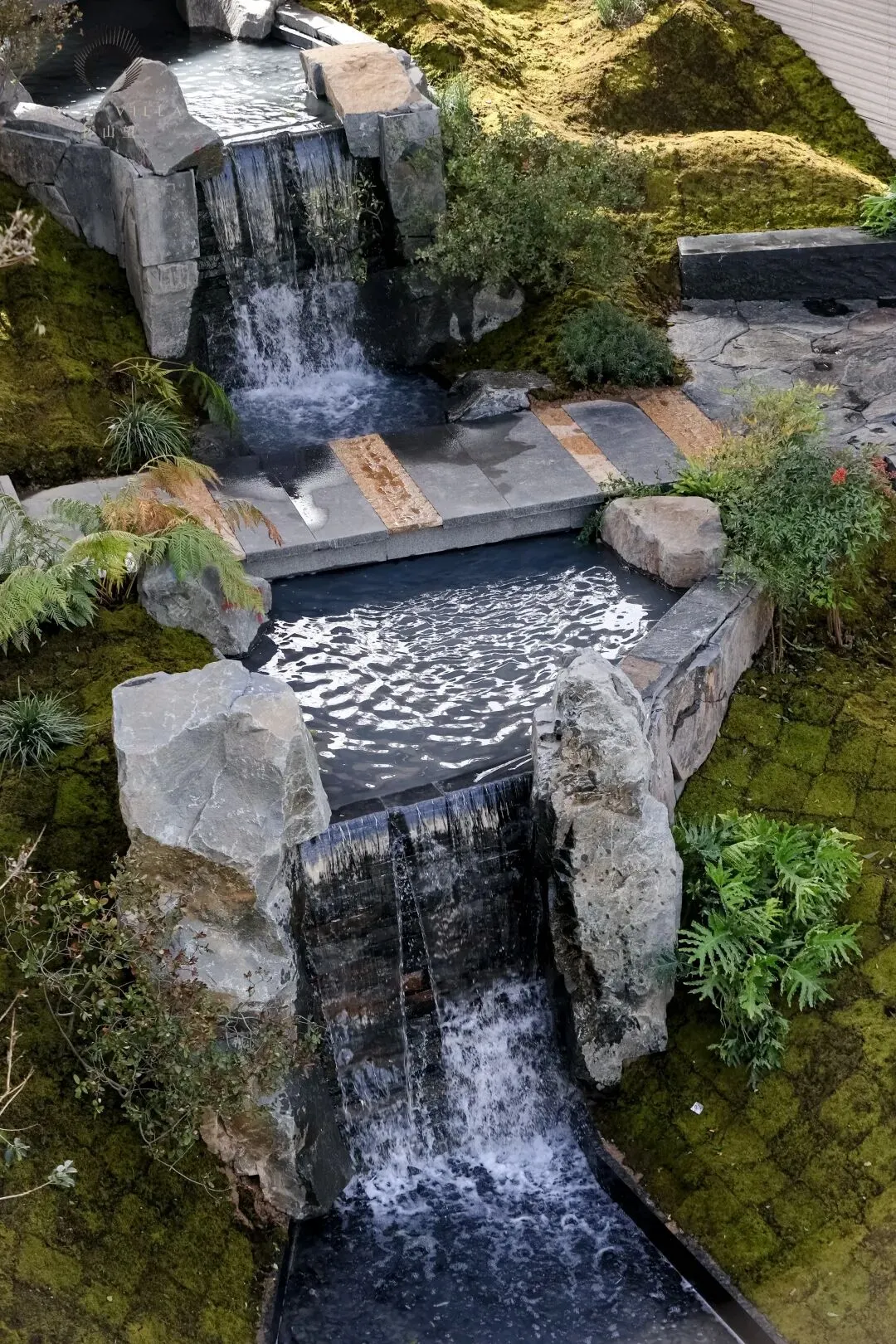 场景的颠覆最为震撼,以“九曲流溪”为脉络,用约400米主轴串联约2100㎡集中景观,用约6米叠水流瀑打造下沉式坡地花园。
