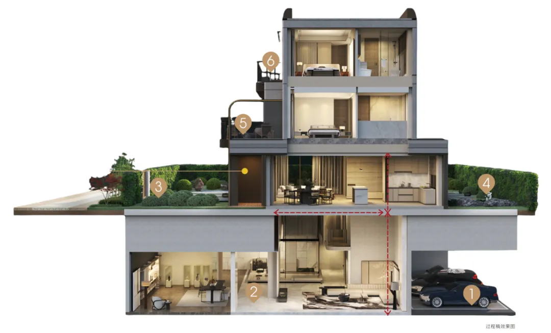 3.1-3.5米地上层高、5.6米地下室挑高、最多6个院落、最大9.4米客餐厅面宽、全套房设计、对标顶豪的全精装交付……