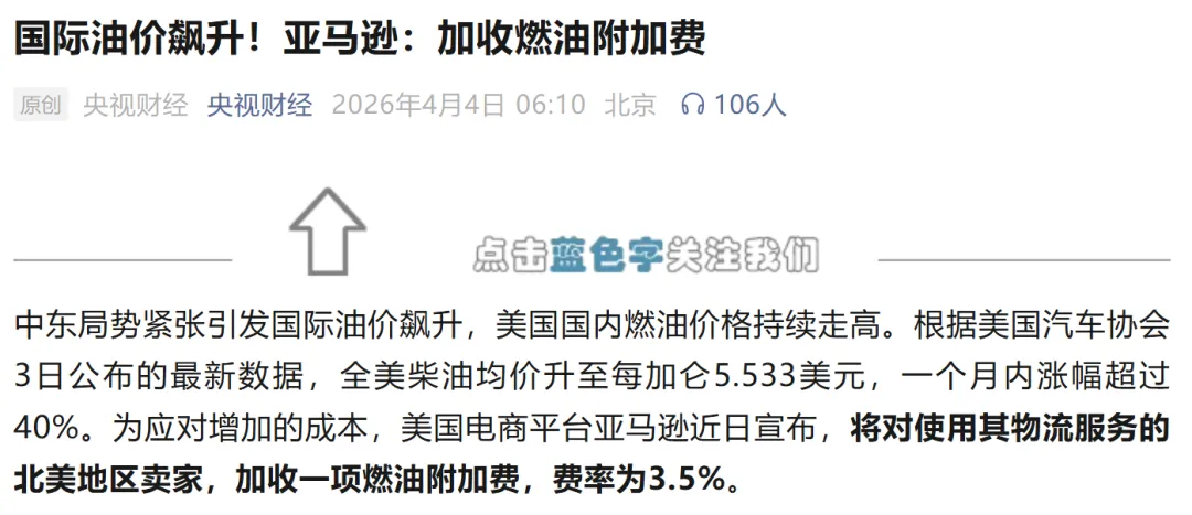 美国电商巨头亚马逊宣布,对北美地区卖家加收一项燃油附加费