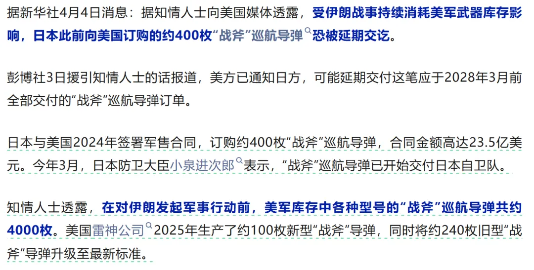 或延期交付日本订购的400枚战斧巡航导弹。