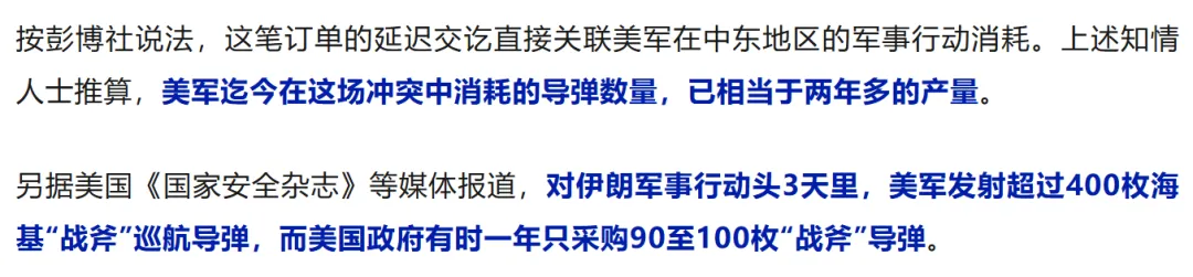 据悉:美国在对伊朗的战争中消耗的导弹数量相当于美国两年多的导弹产量