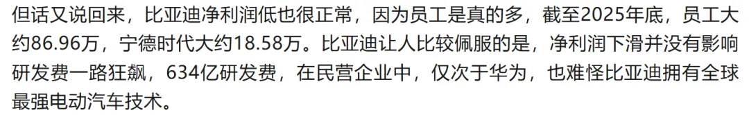 但是,比亚迪的员工总数是宁德时代的4倍,