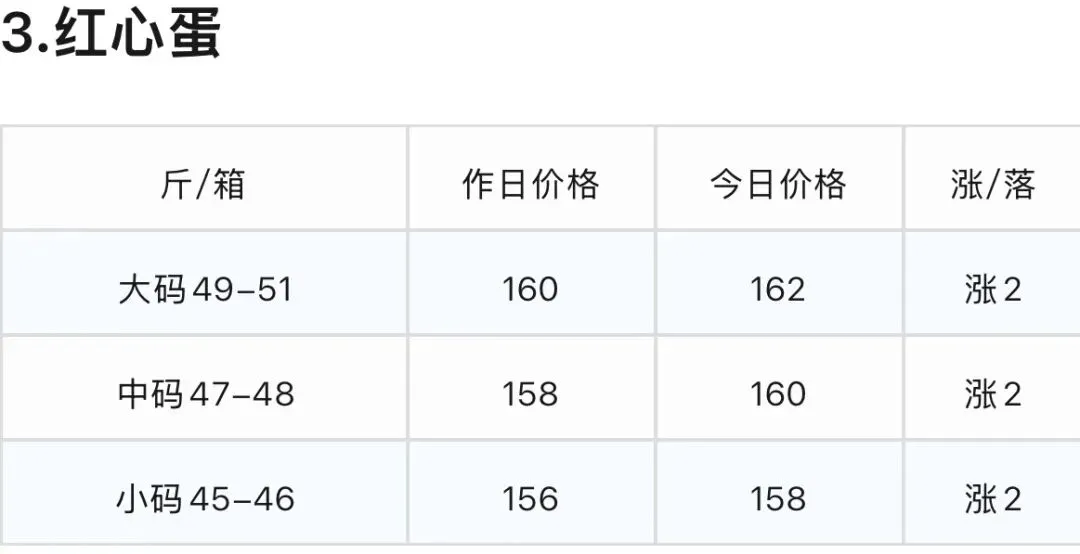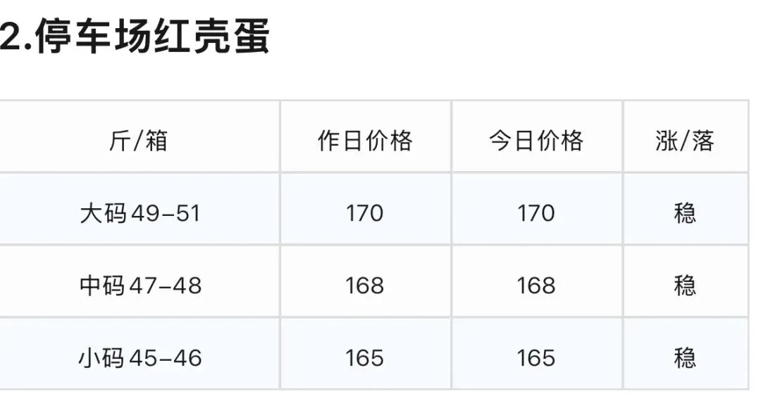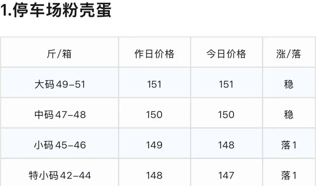 1.今日停车场粉壳蛋大码 中码 价格保持持稳,小码特小码价格下落1元,红壳蛋各规格价格保持持稳,红心蛋各规格价格涨幅2元