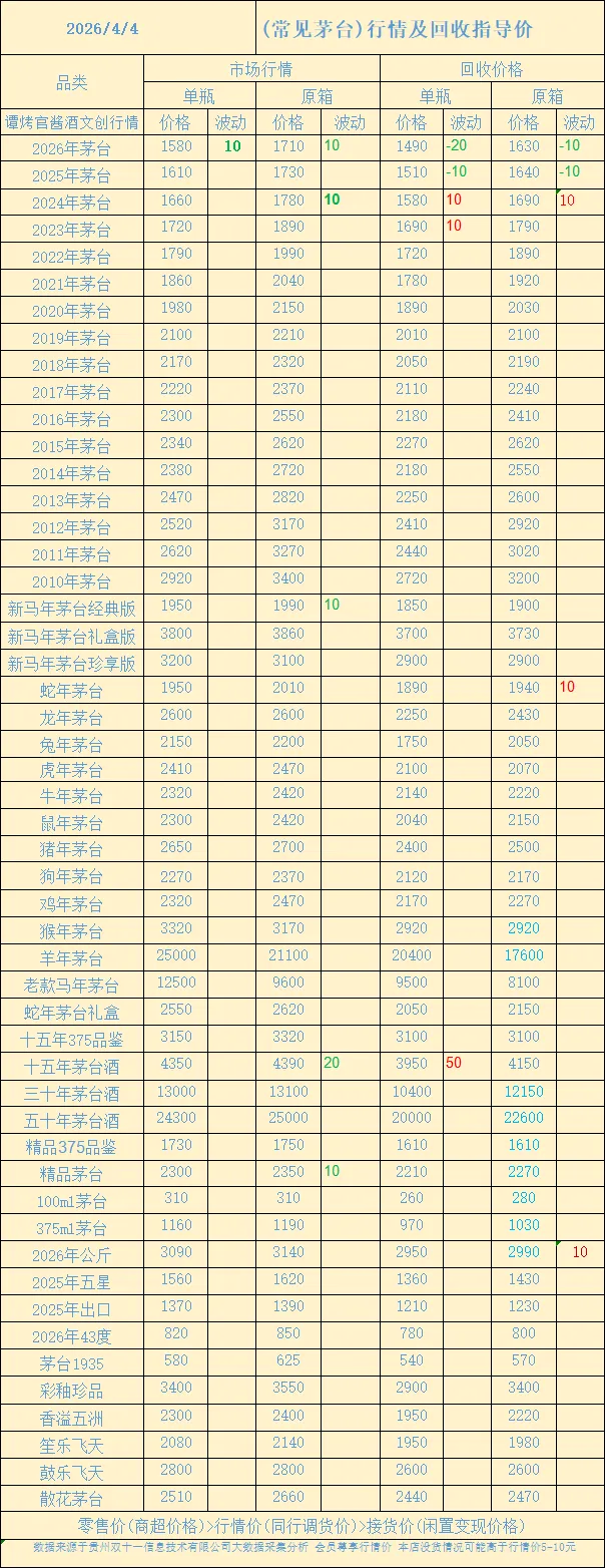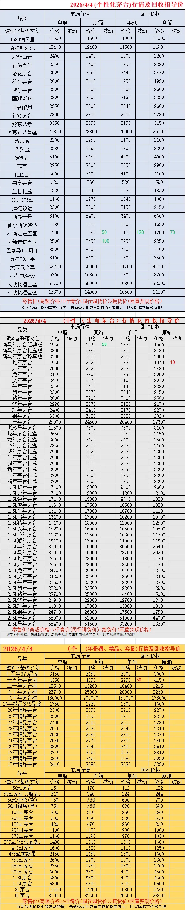 今天是2026年4月4日星期六,与昨日行情相比:常规茅台中:2026年飞天原箱6瓶装,2026年飞天散瓶,2025年飞天原箱12瓶装,2024年飞天原箱6瓶装,精品茅台,十五年年份酒,巽风375ml下跌。生肖茅台中:丙午马年经典版,兔年生肖原箱下跌;蛇年生肖原箱上涨。文创个性化中:新走进五国350ml/275ml,新走进五国700ml/750ml下跌,回收参考价常规茅台中:2023年散瓶飞天、2024年散瓶飞天和原箱飞天涨价,2025年原箱和散瓶、2026年原箱和散瓶飞天跌价,2026年公斤茅台原箱涨价,生肖茅台中:蛇年茅台原箱涨价,文创茅台中:走进五国小原箱和散瓶跌价。