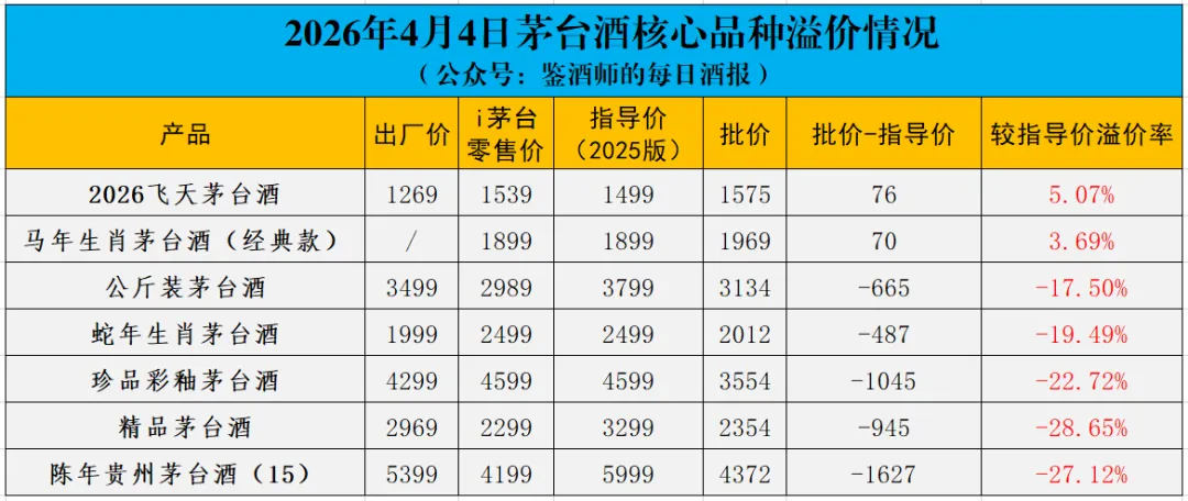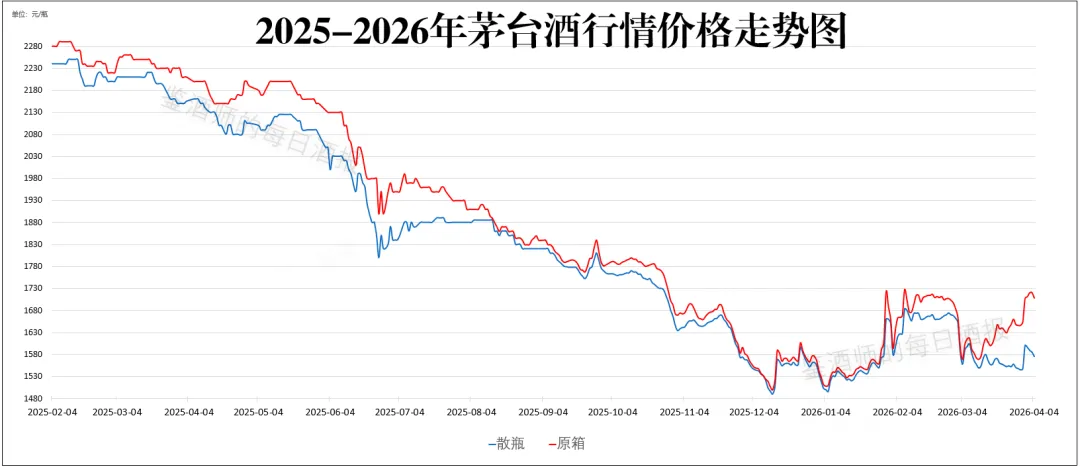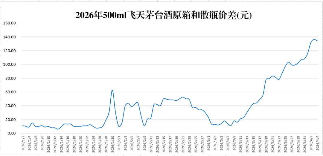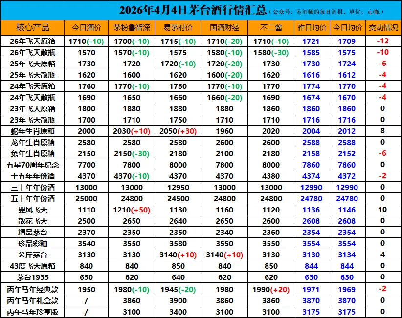2026年4月4日茅台行情监测数据显示,飞天原散价差为134元,较昨日缩小2元。当日2026飞天原箱均价下跌12元至1709元,散瓶下跌10元至1575元。公斤装茅台上涨4元至3134元,折算为500ml约1567元/瓶。2026年4月4日茅台行情价格监测数据: