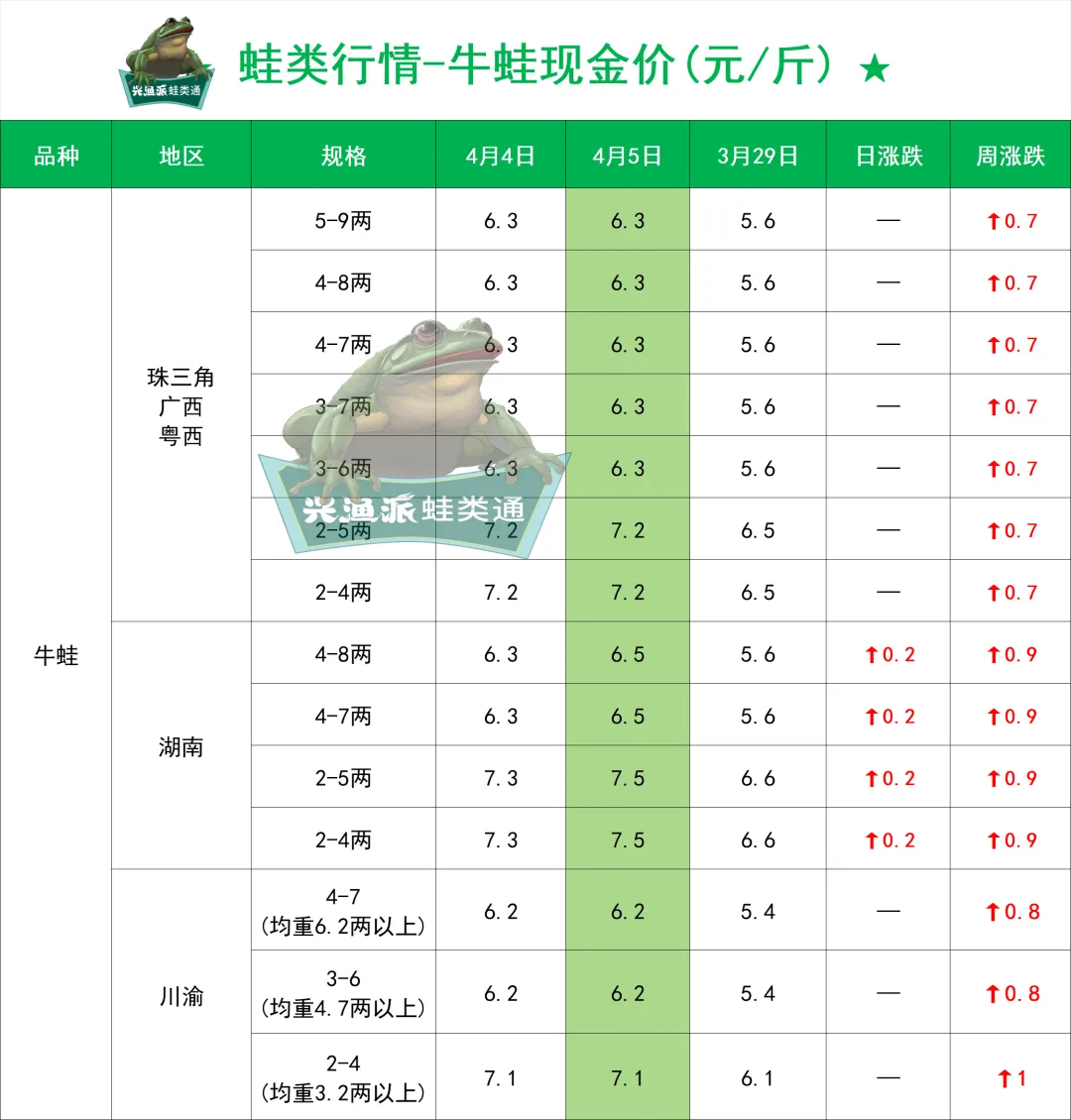 >4月5日全国牛蛙、黑斑蛙、泰蛙最新行情
