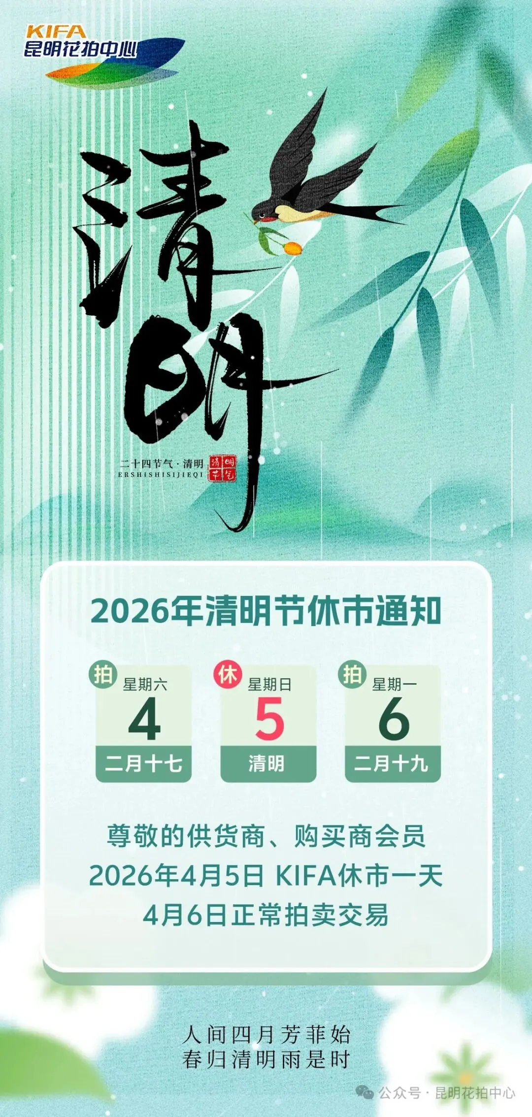 4月4日,昆明花拍中心(KIFA)全渠道交易总量约620万枝左右,全品类综合成交率87.17%。