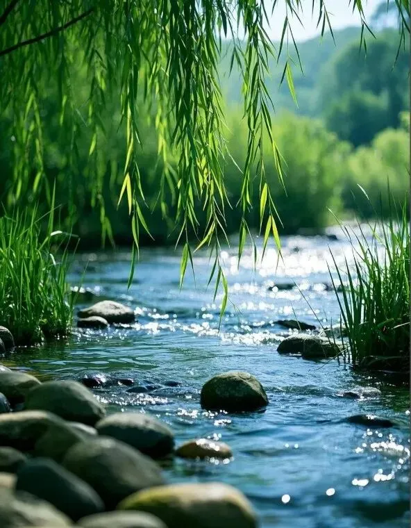 溪水潺潺,绿叶飘。翠柳窸窣,鸟儿叫。春意盎然,喜心颜。