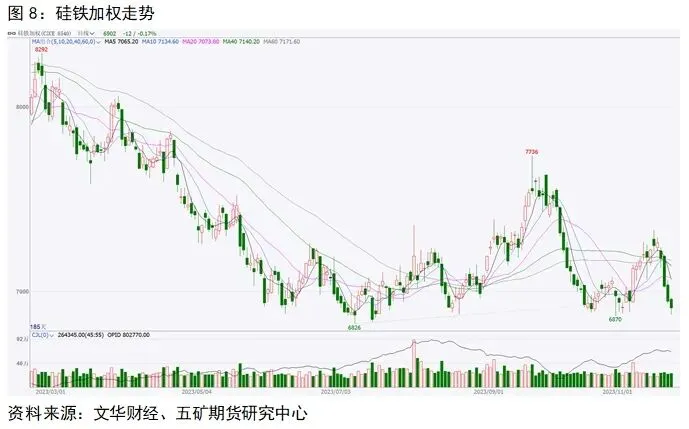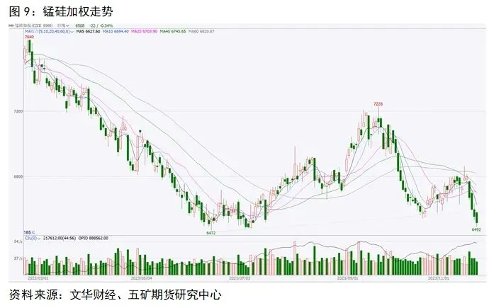 铁合金行业基本面上,铁合金走势与其他黑色品种略有不同,主要原因是产量过高,且还有投产预期。硅铁供给环比再度回升,并创下今年3月份以来的新高,内蒙地区保有相对利润空间仍在支撑供给维持高位,这削弱了供给端的收缩预期。锰硅供给在连续回落之后再度回升,虽然广西及宁夏地区利润明显较差,但内蒙地区仍保有相对的利润空间,这或将支撑供给继续维持高位。而持续在低位的长材产量(暂未看到回升预期)与走低的铁水产量使得锰硅的需求继续维持低位。供求两端的劈叉延续,并未出现边际的变化,这也是压制锰硅价格的最核心因素。