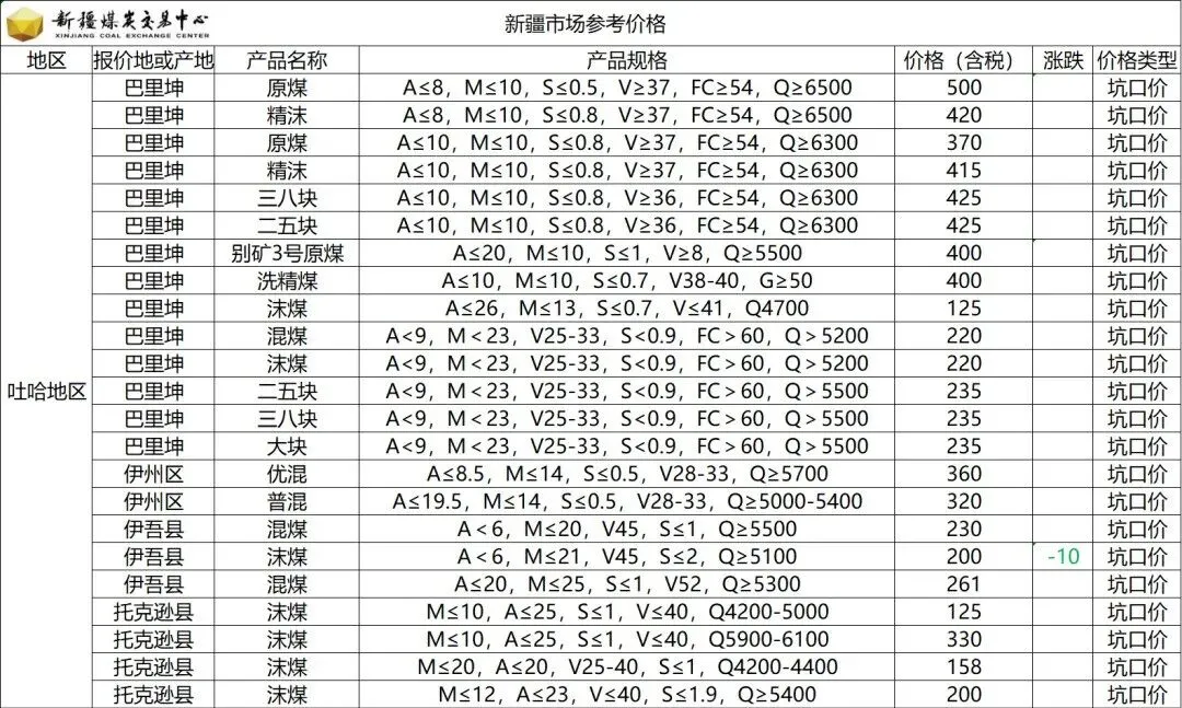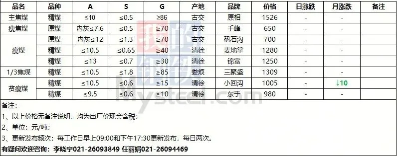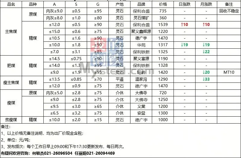 - 主产地价格:山西低硫主焦煤出厂含税价约1510元/吨,中硫主焦煤约1300元/吨,高硫主焦煤约1294元/吨。