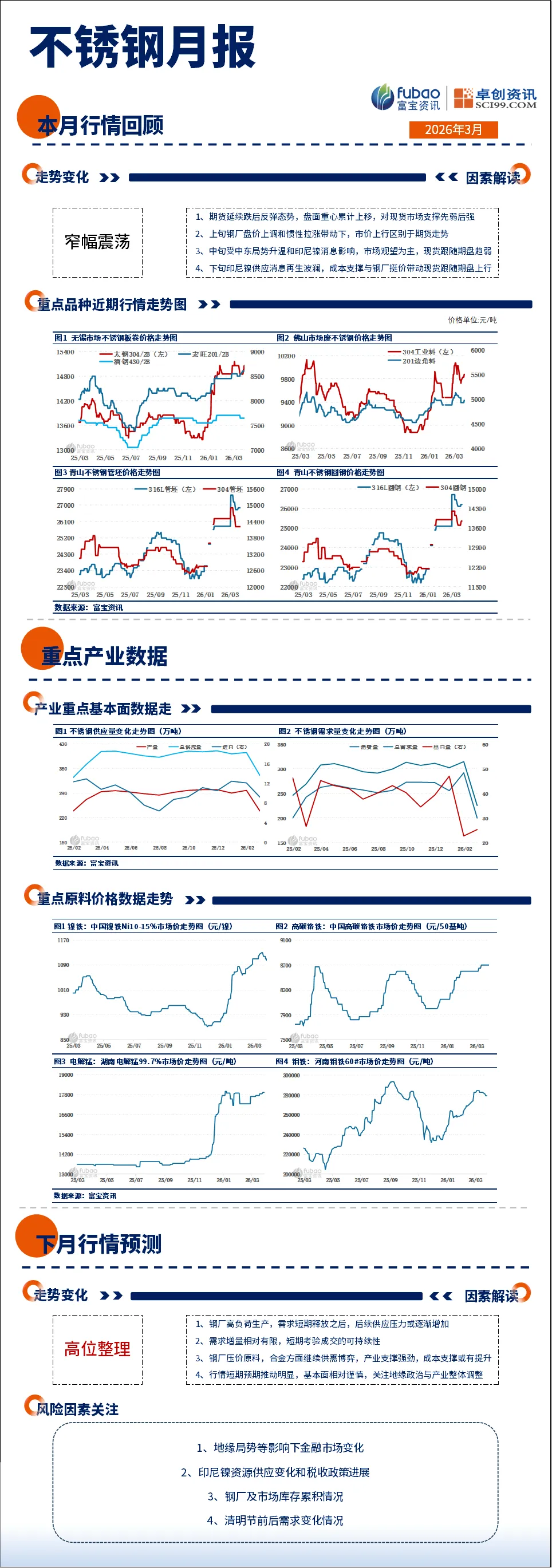 3月初市场复工,市场逐渐恢复活跃,价格受到需求带动持稳运行,连带期盘总体持稳,随后印尼方面政策面影响下,关键原料镍成本提升,支撑不锈钢价格。但随后大厂低开价格以求出货,市场整体跟跌,后因需求强势,商家恢复信心,叠加原料影响共同支撑市场价格反弹回升,市场让利出货为主,整体交易流通性向好。临近月末,出货力度基本接近节前水平,商家持稳灵活成交为主,期盘价格基本修复至稳定位置,但供需压力仍存,市场仍持有一定谨慎态势,部分观望运行。