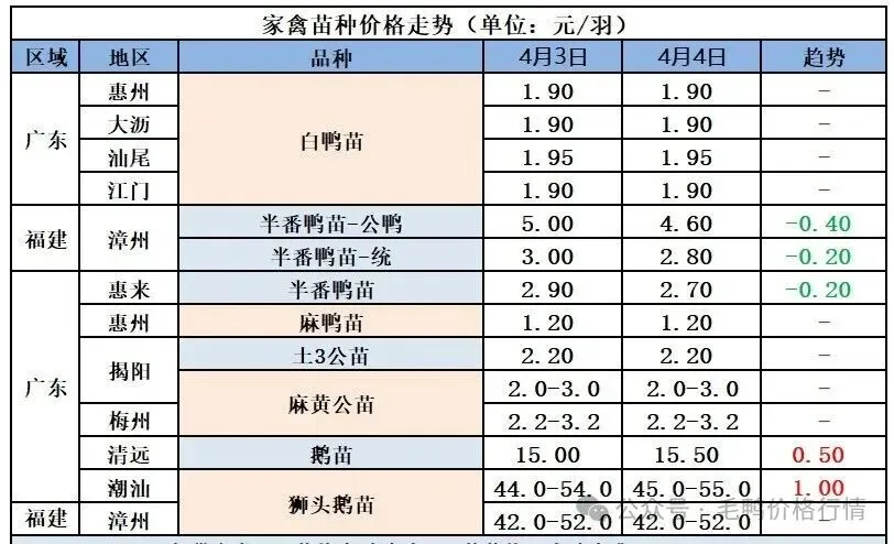 2026年4月5日鸭苗价格行情:(单位:元/羽)