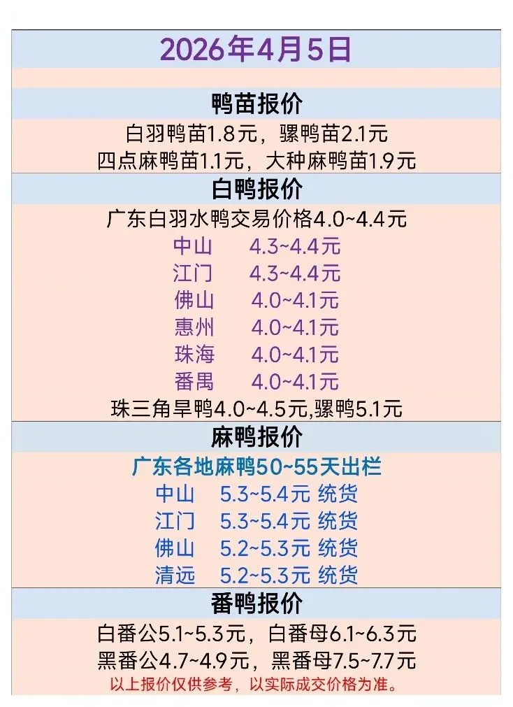 2026年4月5日鸭苗、毛鸭行情报价(参考)