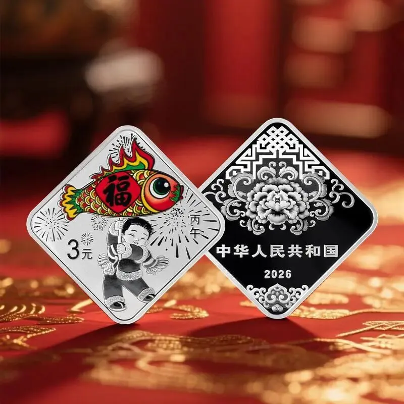 今年春节前,我去北京马甸邮币卡市场转悠。一位熟悉的币商老李正忙着打包发货,桌上堆满了刚拆封的2026年贺岁银币。见我过来,他递给我一枚菱形的小银币说:"今年的福字币,发行量砍到100万了,你猜能涨多少?"我接过来看了看,币面上两个孩童举着鱼灯,彩喷工艺在灯光下泛着温润的光泽。老李又补了一句:"2015年那会儿,60万枚的福字币最高冲到1300,翻了十多倍。这回减量,会不会再来一波?"