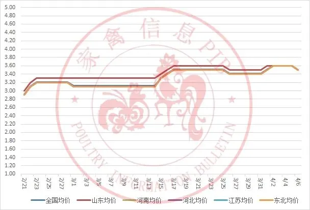 2026年2月21日-2026年4月6日主流地区白羽鸡鸡苗均价走势图