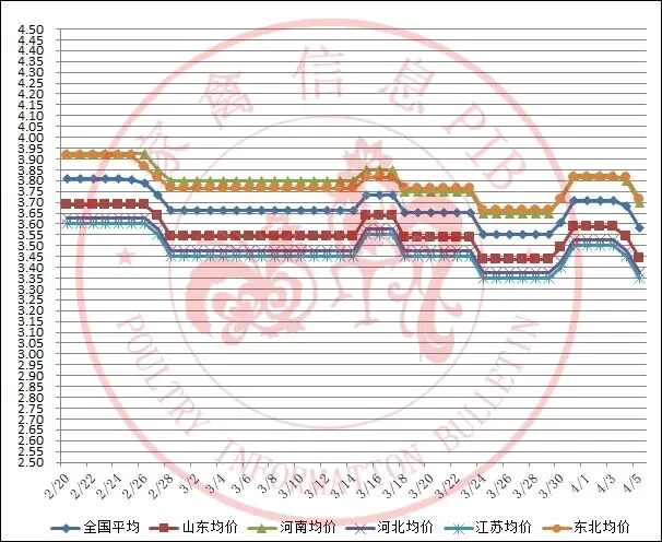2026年2月20日-2026年4月5日主流地区白羽鸡毛鸡均价走势图