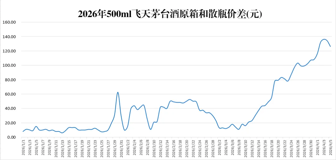 2026年4月5日茅台行情监测数据显示,飞天原散价差为126元,较昨日缩小8元。当日2026飞天原箱均价下跌17元至1692元,散瓶下跌9元至1566元。公斤装茅台上涨16元至3150元,折算为500ml约1575元/瓶。2026年4月5日茅台行情价格监测数据: