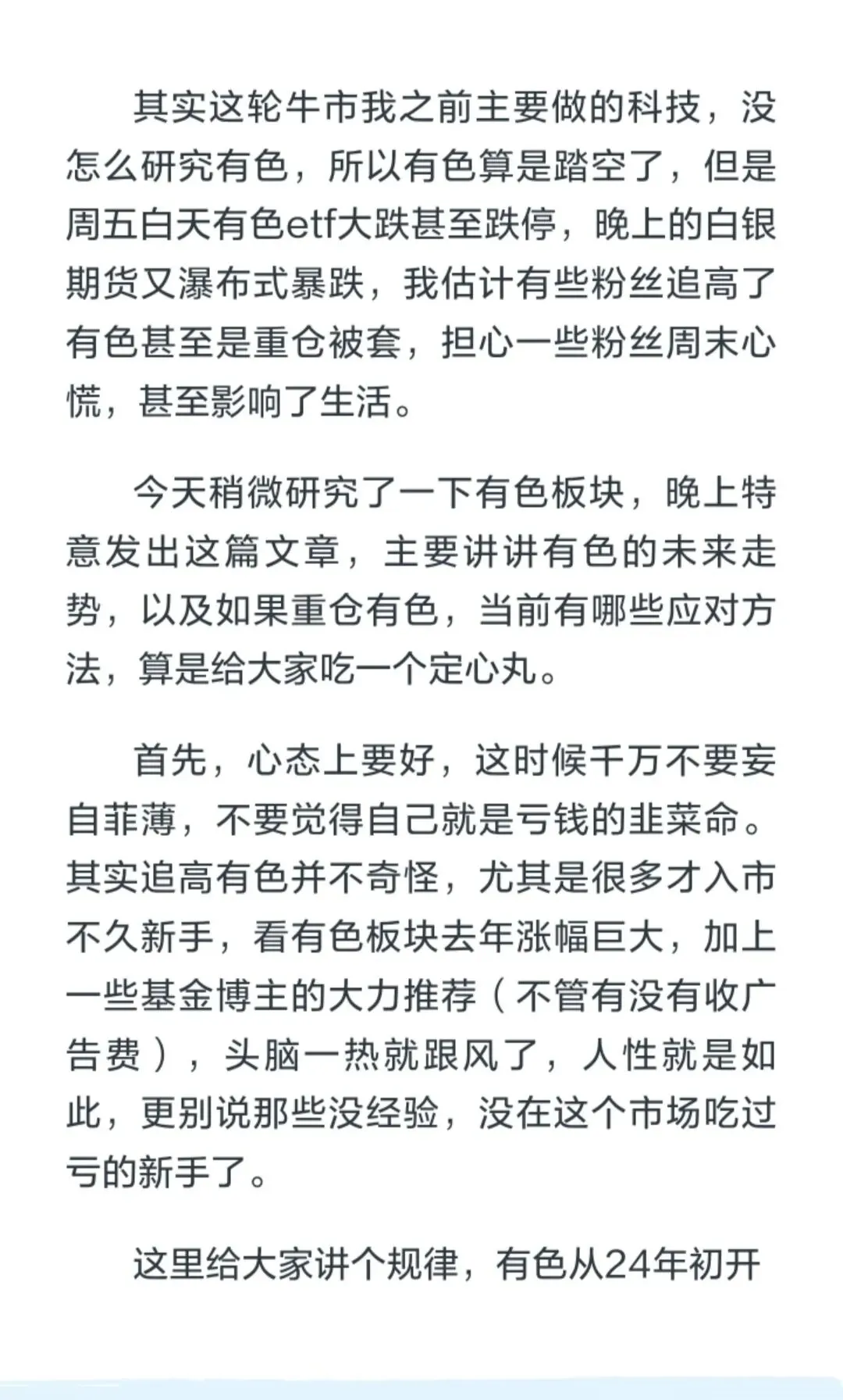 其实这轮牛市我之前主要做的科技,没怎么研究有色,所以有色算是踏空了,但是周五白天有色etf大跌甚至跌停,晚上的白银期货又瀑布式暴跌,我估计有些粉丝追高了有色甚至是重仓被套,担心一些粉丝周末心慌,甚至影响了生活。