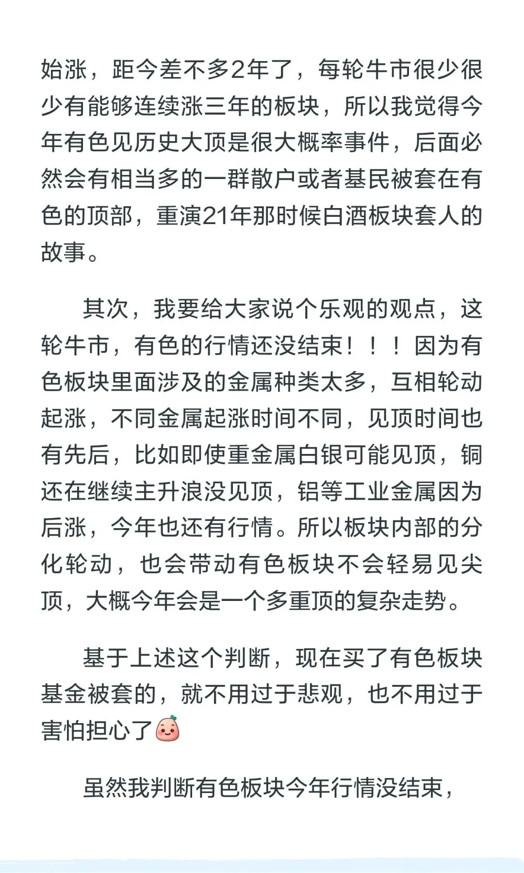 虽然我判断有色板块今年行情没结束,但是我明确建议大家没买有色的就不要去做了,毕竟处于历史高位,现在做和24年做,收益与风险的性价比完全不一样!该恐高的时候还是要恐高的,很多时候无畏的原因可