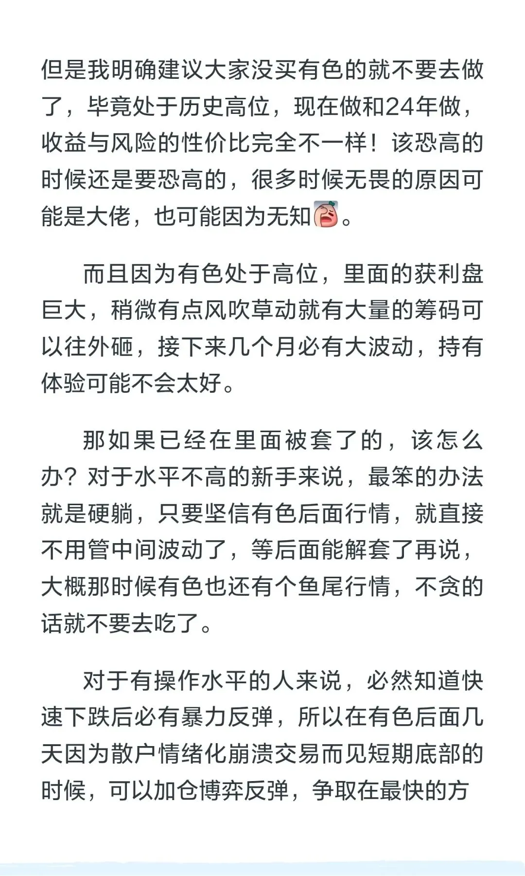 对于水平不高的新手来说,最笨的办法就是硬躺,只要坚信有色后面行情,就直接不用管中间波动了,等后面能解套了再说,大概那时候有色也还有个鱼尾行情,不贪的话就不要去吃了。