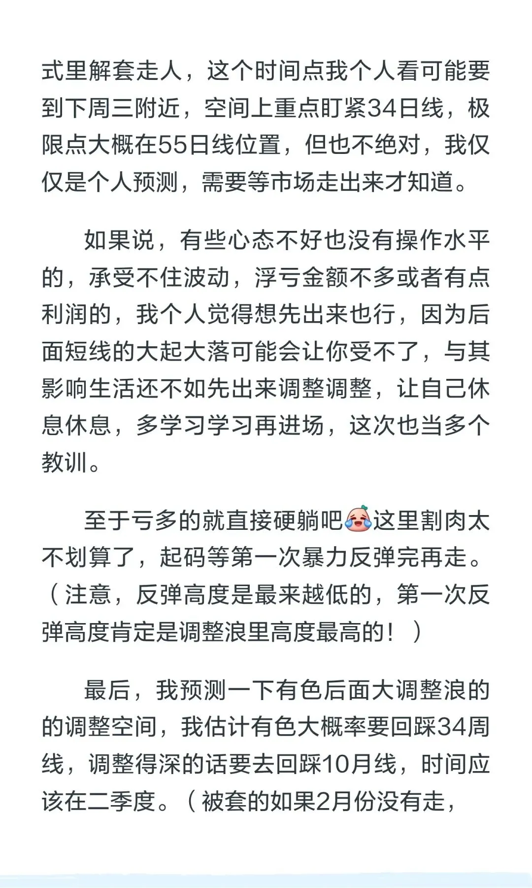 最后,我预测一下有色后面大调整浪的调整空间,我估计有色大概率要回踩34周线,调整得深的话要去回踩10月线,时间应该在二季度。