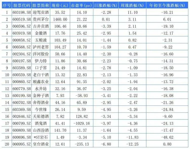 数据显示,本周20家白酒A股,其中收涨6家,收平0家,收跌14家。