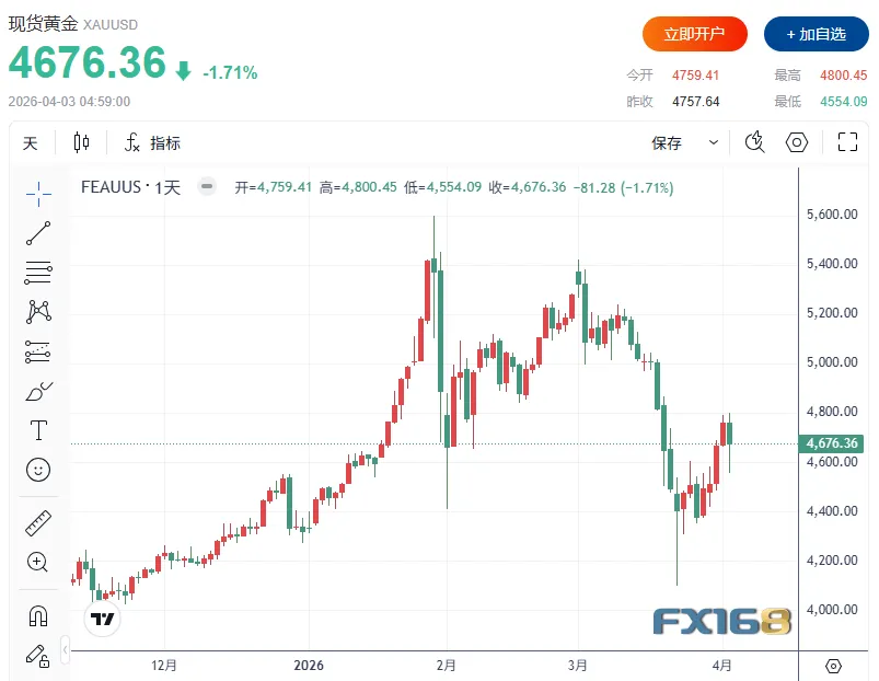 周五,现货黄金收报4676.36美元/盎司,周线上涨183.43美元,涨幅4.08%。
