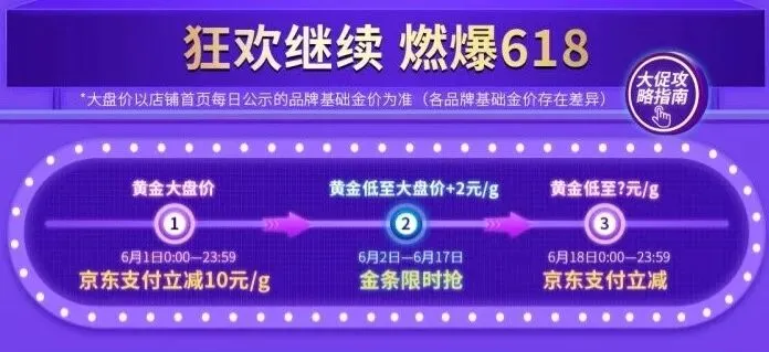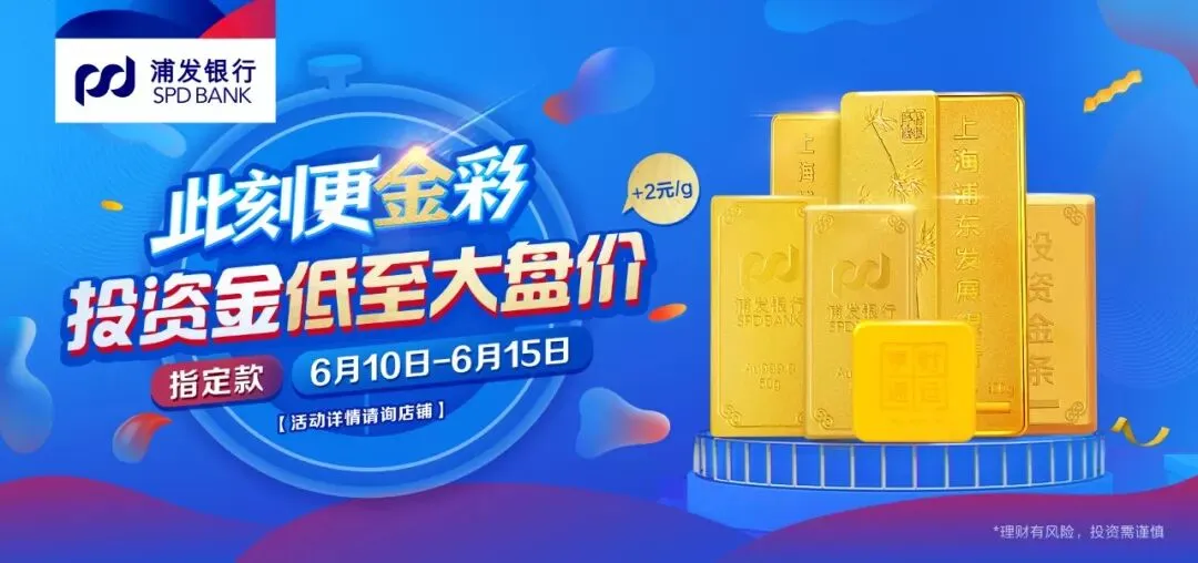 6月10日-6月15日,指定款投资金低至大盘价+2元/g,更有买指定款金条送大额金条优惠券等活动。