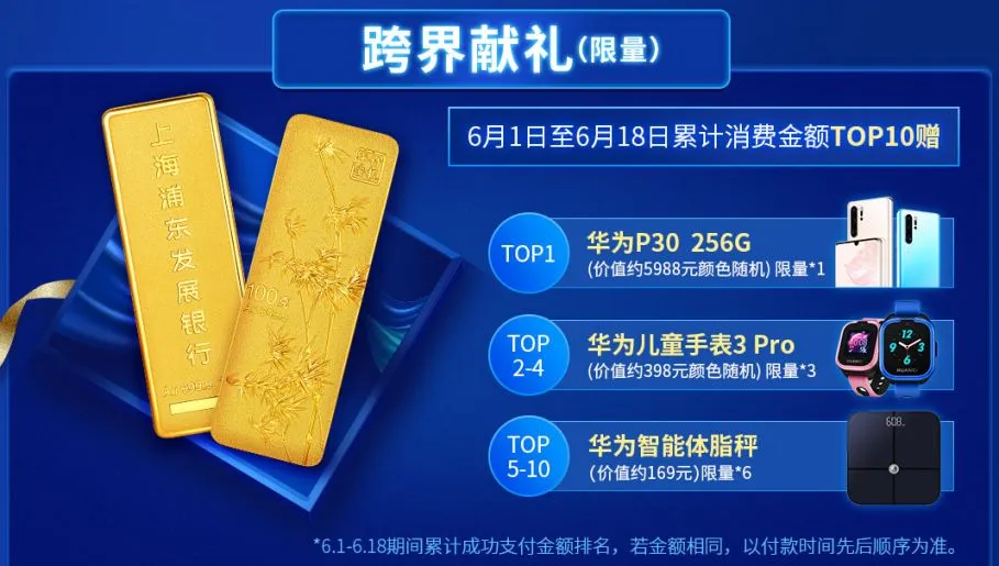 除了以上优惠活动,浦发银行还为品牌用户准备了华为P30手机、华为儿童智能手表、华为智能体脂称等丰厚礼品。6月1日至6月18日,店铺累计消费金额TOP10即可获得。