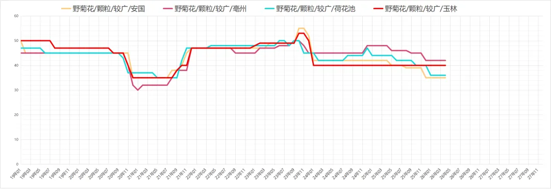 野菊花行情平稳,可供货源充足,近期走销一般,现市场野菊花统货多报价在40元上下,精选货多报价在60元上下,继续关注后期货源走销情况。