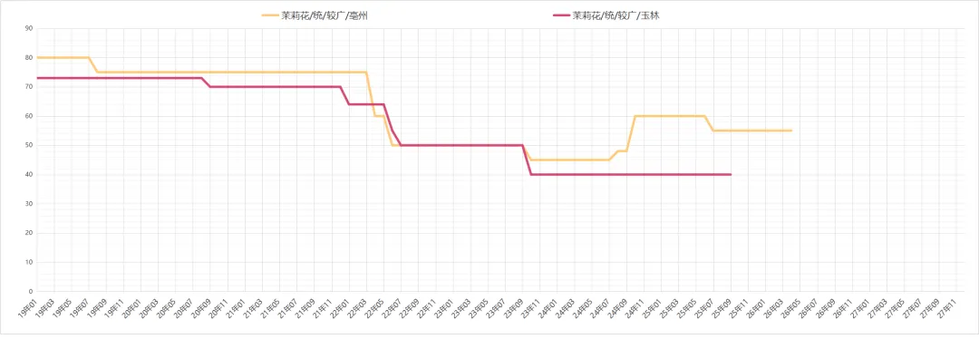 茉莉花行情保持平稳,市场寻货商家关注力度较弱,四月正值花开,鲜花产区不同价格不等,货源走销以小批量走动为主,现广东统干货价格在65元上下。