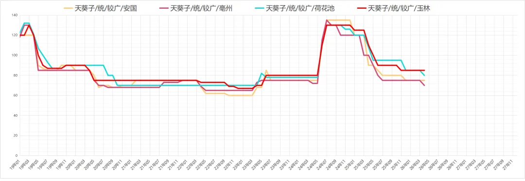 天葵子价格下滑,新货陆续上市,货源走动放缓,现统货价格在65-70元;包含量的陈货要价仍偏高,在75-80元之间。