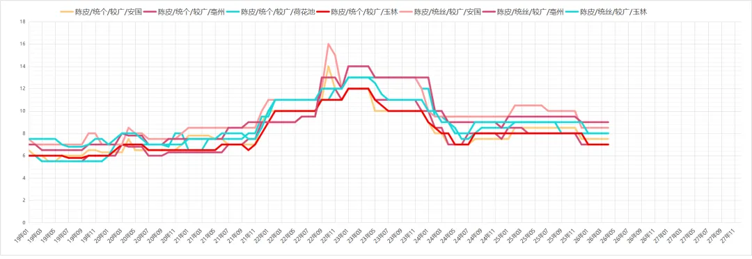 陈皮行情保持平稳,可供货源充足,最近关注度不高,目前市场药厂货个子多要价在5元左右,好货个子报价在6.5-7.5元之间,而陈皮丝较好货报价在8.5-9.5元之间。