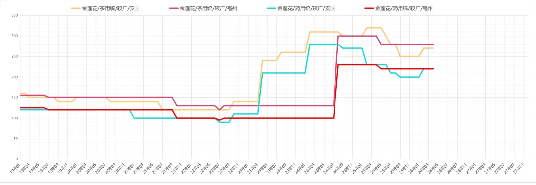 金莲花价格与年前基本持平,最近批量走动平稳,且行情少商关注,目前市场茶用货多要价在260-280元之间不等。