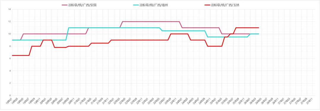 凉粉草行情疲软,可供货源有量,但受需求不旺,货源交易量仍不大,目前市场一般货多要价在10元左右。