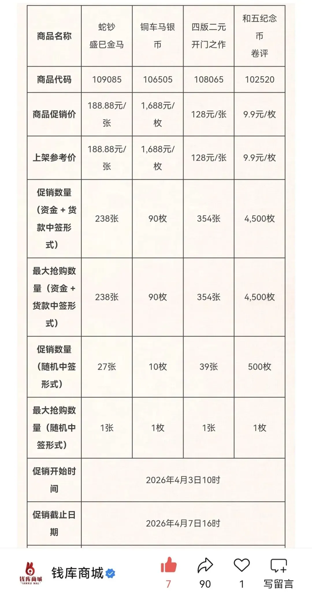 关于《蛇钞盛巳金马》《铜车马银币》等商品开展促销抢购活动的公告