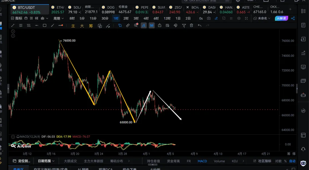 2) 当前已经到关键时期了,如果今晚到明天,大饼始终不跌破65000,那么很有可能会不创新低出个二买,走一笔4h级别的反弹