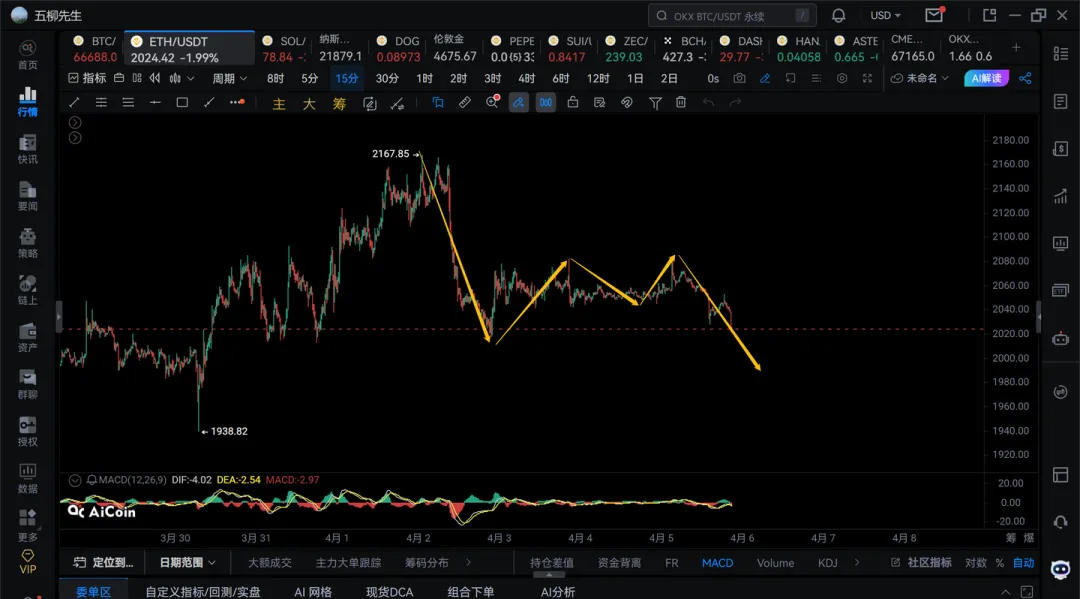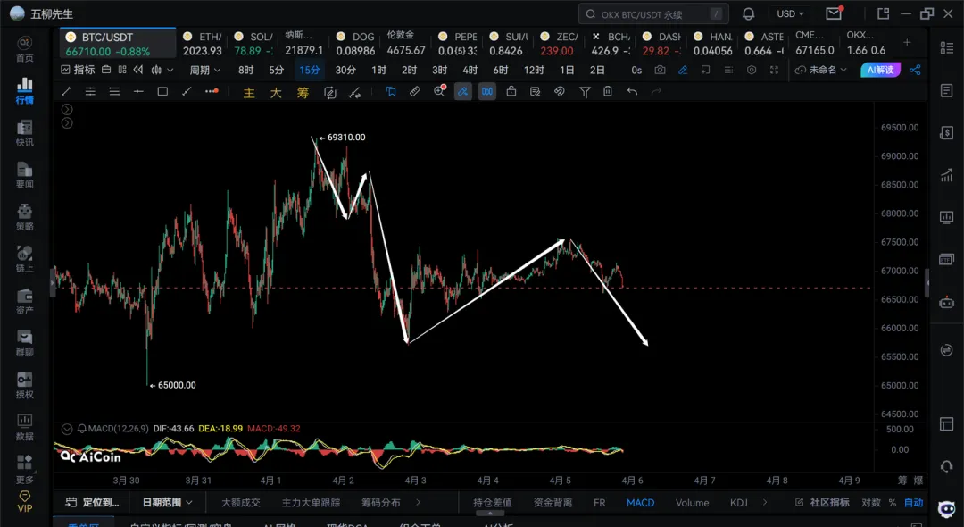 1)15分钟级别正常是还差一笔回踩去66000下方的,耐心等待,看看晚上能否走出来