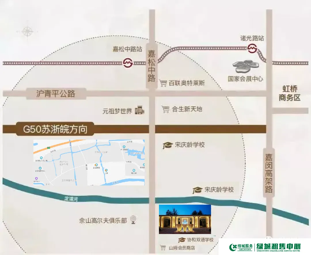 毗邻佘山生态秘境、虹桥枢纽,宋庆龄国际学校等名校环伺,奥特莱斯等高端商业+高尔夫休闲配套齐全,交通路网便捷,高端生活需求一站式满足