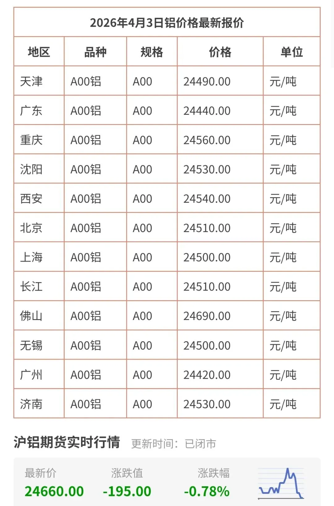 今天4月5日更新,今日铝价行情查询,包括天津、广州、上海、北京、无锡、广东、佛山等地区铝现货价格!长江有色铝锭最新价格是多少钱一公斤一览表