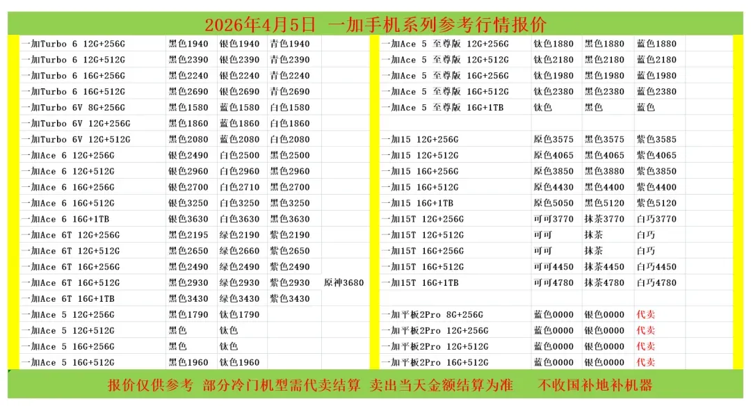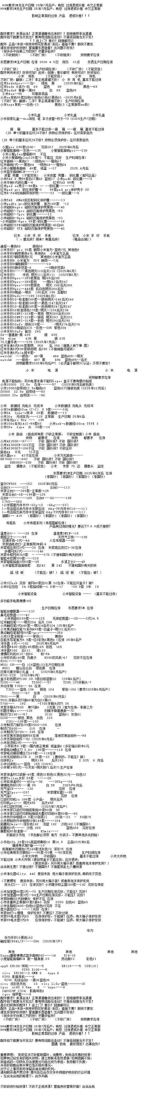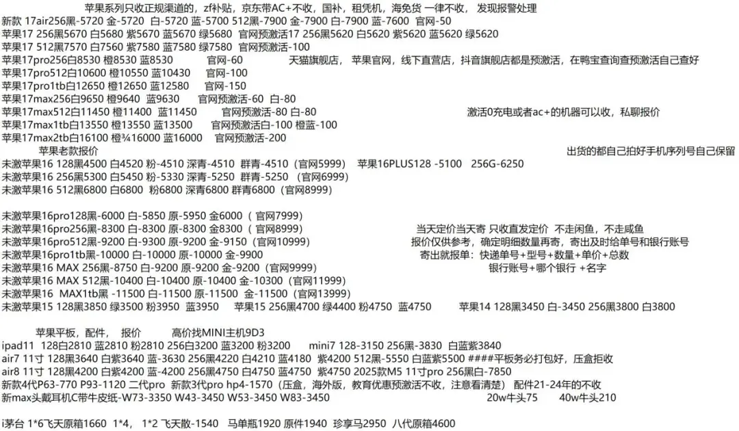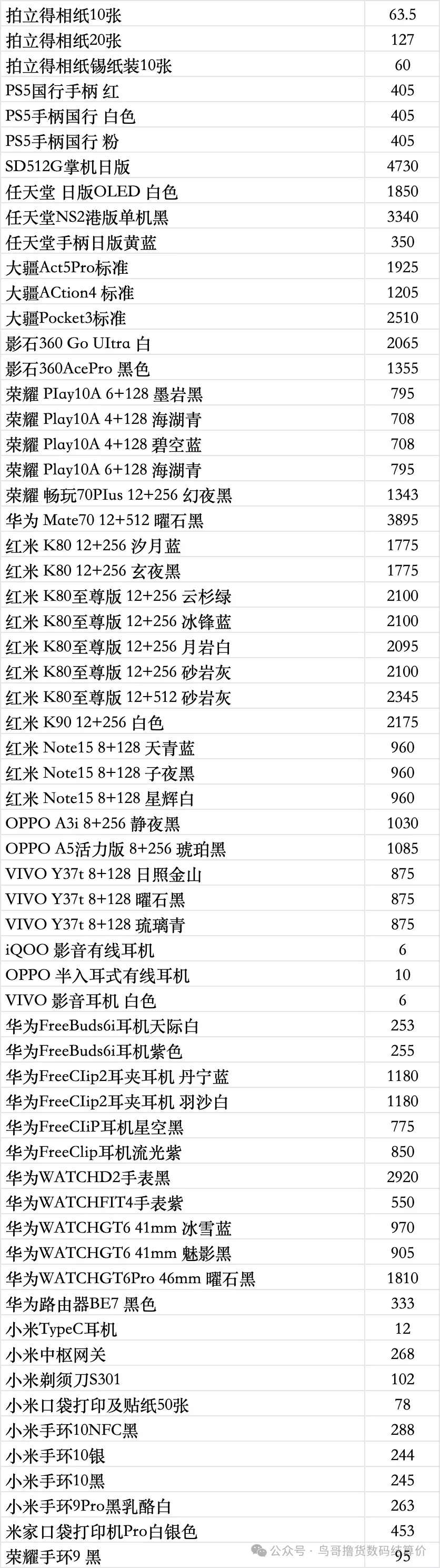 任天堂游戏机: 新款二代NS2港版标配机:3340 新款二代NS2港版马车机:3590,没游戏码:3290(注意下单要看有没有游戏码的 要不然就是便宜的) 新款二代NS2新加坡版 台版 单机:3240,就是没有游戏的 新款二代NS2韩版 欧版 美版 单机:3210,就是没有游戏的 新款二代NS2新加坡版同捆:3540,没游戏码:3220 NS2港版宝可梦同捆:3600 OLED屏 日版白-25年生产日期1845,非25年-30 彩色-1990 OLED屏 港版白-1795 彩色-1875 OLED屏 国行白-1645 彩色-1645 OLED屏 朱紫港版-1970 日版-1970 OLED屏 喷射港版-1970 日版-1970 健身环国行-145 海外版-335 LITE日版 港版 蓝:1035,黑粉1035,绿黄1035 注意区分,这些就不是oled屏的 价格以下(续航版) NS续航国彩-1420 黑-1300,拆封-50 NS续航日彩-1550 黑-1460 长款-30 索尼PS5游戏机 (PS5都要留好纸箱带来,以免破坏品相) 2024新款:PS5 PRO日数:5640 2024新款:PS5 PRO港数:5840 2025新款:PS5 PRO国数:5690 2023新款ps5 日版光驱Slim:3570 2023新款ps5 日版数字Slim:3070 2023新款ps5 国行光驱Slim:老款:3500,2025新款3510 2023新款ps5 国行数字Slim:3060 2023新款ps5 港版光驱Slim:3620 2023新款ps5 港版数字Slim:3060 PS5国行手柄普通色:405,珠白靛青凫绿420,外版-30 PSP串流机:1475白,1475黑 PS5单国光驱:545,外版505 ROG XBOX :6730 OLED SteamDeck掌机掌上游戏机 512G 美:4630,日港:4630 OLED SteamDeck掌机掌上游戏机 1TB 美:5330,日港:5330 大疆3标准:,全能: 大疆Action4标准:,全能: 大疆ACT5 Pro标准:,全能: 大疆action5pro畅拍: 大疆AC6标准: 大疆AC6畅拍: 大疆NEO标配:,全能: 大疆OM7P:,om7: 大疆 mic1拖1:,1拖2: o4图传: 拍立得MINI12影像花室套装:,外版,一次成像礼盒装 拍立得SE国行:,白色: 拍立得相纸20张:126,10张:63 拍立得锡纸装10张:61 任天堂 手柄 NS左右手柄:355 NS2左右手柄:420 NS2 PRO 黑柄:420 PRO国黑柄:310,外版280只收跨境 PRO乱斗柄:330只收跨境 PRO王泪柄:330只收跨境 PRO喷射柄:330只收跨境 PRO异度柄:330只收跨境 4月5 行情参考 大疆pk3标准2500 大疆pk3全能3230 大疆ac4标准1200 大疆ac5标准1920 大疆ac5畅拍2450 大疆ac6标准2630 大疆ac6畅拍3220 大疆nano 64 :1740 大疆nano128:2000 大疆o4pro图传1400(26年一月份的不要) mini一拖一 手机版 175 mini一拖二 手机版 245 mini一拖二 465 【大疆系列只收待更新状态的机器 后封/在保代卖或扣款】 影石acepro一代1365 影石go3s 64 黑白1430 影石go3s 128 黑白1630 影石acepro2单电黑2340 影石acepro2单电白2390 影石acepro2双电黑2400 影石acepro2玩拍套装3500 影石x5标准黑2590 影石x5全能3100 影石go ultra黑2060白2060 影石aceproPro2 街拍黑 270银 280 影石128内存卡170 影石256内存卡300 影石512内存卡600 遮光罩65 影石114自拍杆65 华为 Watch FiT4 黑535白555绿575紫550银585 华为 Watch FIT4 pro 黑1055蓝1030绿1115 华为WATCH FIT 3 黑400灰425月光白400原野绿425粉415薄荷绿415蓝415珍珠白435 华为WATCH FIT 2活力款 黑色315粉310 Watch D2 黑 2925白2855蓝2865 药房版 2545 Watch buds 黑1095卡其色 1195 Watch 5 46m 黑1770紫2145棕 2185蓝1875钛空银 2475 Watch 5 42m 黑1675白1820杏2245绿1685金2345 非凡2 黑4845蓝5845 非凡手表 黑2995 华为新款WATCH GT6系列 GT6 pro 黑1810棕2115钢2525 GT6 46m黑 1085灰色 1265绿色 1395 GT6 41m 黑 905棕色 1355白色 1215紫色1005蓝970青975 华为新款WATCH GT5系列 GT5 46黑1005蓝925棕835灰845 GT5 41 黑 875蓝740白835青785棕735 GT5pro 黑1085陶瓷2055钛钢色 1345冰川白975 华为儿童手表系列 儿童4pro蓝470粉475 儿童5pro 蓝730粉725绿725紫735 儿童5X 蓝675粉685 儿童5Xpro 黑995紫1075 儿童5 绿370紫370蓝415活力蓝355红335 儿童5星耀 粉430蓝430 荣耀,华为手环 荣耀手环9标准黑93蓝100紫100 荣耀手环9NFC 黑120蓝120紫120 荣耀手环10标准黑138绿138灰138蓝138 荣耀手环10NFC 黑155灰155绿155蓝150 华为手环系列 华为手环8标准黑103粉105 华为手环8NFC 黑105 华为手环9 黑135白125粉125 华为手环9nfc版 黑145白135粉135 华为手环10标准 黑163粉163 华为手环10铝合金款 黑160白165蓝167紫168向新绿160原野绿155灰160 华为手环10NFC 黑192白192蓝192紫195绿192 华为手环11 标准版 羽砂黑 200流光紫 195 华为手环11 铝合金版 羽砂黑 210星云杏215流光紫215悦动白215草木绿 215 华为手环11 NFC版 羽砂黑 230星云杏 235流光紫 235悦动白 235草木绿235 华为手环11pro NFC版 羽砂黑 285海岛蓝285原野绿285 B7 黑655灰675 华为耳机系列 华为Free Arc 绿400灰410黑410白395 华为 FreeBuds 7i 白335灰330粉337 华为freebuds6i耳机 白250黑245紫252 华为耳机Free clip2 黑1190白1185蓝1185金1200紫1220 华为耳机Free clip 黑色820暖星云845紫 775玫瑰金780 华为耳机FreeBuds 5i 黑207白218蓝220 华为FreeBuds se2 耳机 白70蓝72黑72紫72 华为 FreeBuds se3 黑100金100白98 华为 FreeBuds Se4 白123黑121 FreeBuds 6 白485黑490紫490金485 FreeBuds 4e 2024款 白295银295 FreeBuds pro5 白1075银1090金1070蓝1090 FreeBuds pro4 黑660绿675白675 华为CD56 pro笔 445 华为CD57 黑250白265 华为CD54S 三代笔288 华为 三代笔充电器 80 Wifi5 黑173白173青173 WiFi3 pro 270 AX3 125 AX6 new 235 AX3 pro new 185 AX3 pro WiFi7 187 BE3pro 千兆版 180 BE3pro 疾风版 169 BE7pro 390 AX2pro 100 荣耀手表 荣耀手表4pro 黑695棕745绿745 荣耀手表5pro 蓝牙版黑1105灰1085 荣耀手表5pro 插卡版黑1195灰1195 荣耀手表5Ultra黑1215棕1475钛金属1895 荣耀手表5 黑565金565 移动电源 华为22.5w se 移动电源 黑85白88 华为66w 电源 白180蓝180 |