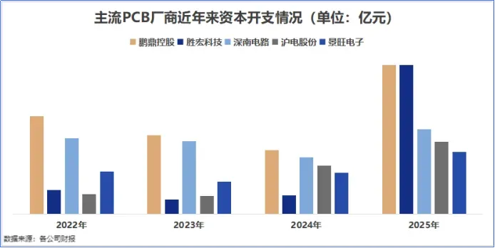 资本开支的数据更为直观,2025年国内主流PCB厂商的资本开支大幅增长。其中鹏鼎控股、胜宏科技增幅较大,分别同比增长133%、693%。