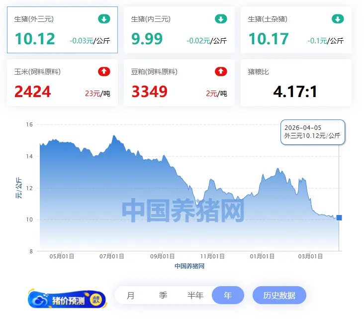 2026年04月05日(星期日),中国养猪网“养猪数据中心”监测的生猪价格以及饲料原料价格明细如下: