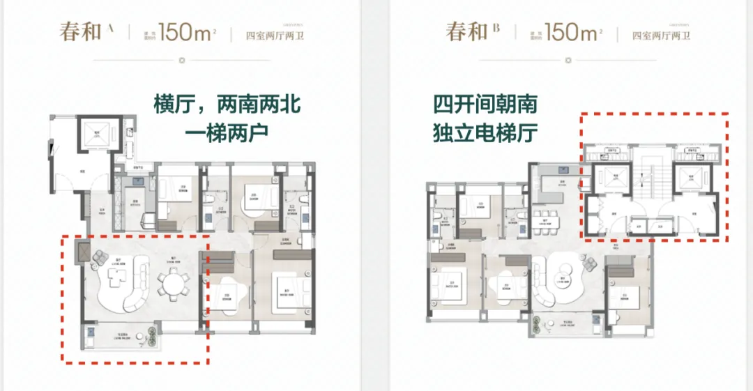 建面约150㎡4室2厅2卫户型,整体尺度上更为宽绰,