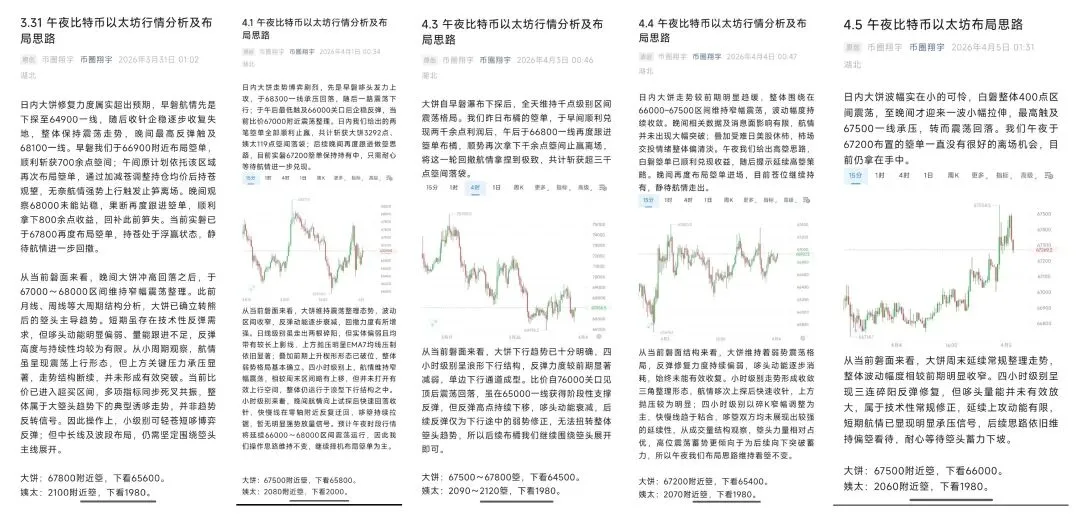 时光流转,本周航情已近尾声。回顾本周大饼整体走势,较前期节奏明显趋缓,全周波幅仅4000余点。先是周初回调下破65000关口,随后进入震荡修复阶段反弹最高触及69300一线,后续承压回落一轮瀑布下行,后续经过修正,在66500附近维持区间震荡格局。因本周航情整体波动有限、趋势延续性较弱,公开策略发布相对较少,所以团队精力主要聚焦于实磐精细化操作。但整体战绩保持稳健,过程中虽有扫笋,但核心关键航情均精准把握,整体收益还算可观。