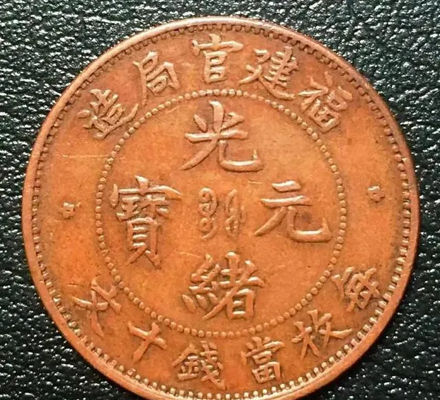 图里这枚就是福建官局造的光绪元宝闽关十文,颜色看着偏红,老包浆仔细看像酱油撒了一层,十文面额,边上的颗粒感,正面一圈字雕得紧密,老家那会儿谁家要过年分钱,桌脚边蹦出的八成是这批铜子,行情的话,今年1月高分的MS63RB,线上能拍到6300块,普通点的MS62RB要便宜点,大“闽关”版的直接一脚踏到16000去了,说白了还是版别稀罕+高分现在认得的都盯着,看版别、看分数,千儿八百到万把块全有,老铜钱的行情两头分得清。