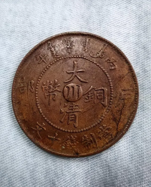 这面铜钱叫大清铜币四川户部造十文,文字都靠中间挤着一坨,布景素净,线条挺硬,十块钱的大写,小时候奶奶讲过,那会儿要买盐尝酱,衣兜里头翻的就是这种,行情其实老百姓也挂念,普通钱没大水花,但遇上包浆自然的高分品,价格就能跳起来,懂得都找高分,毕竟流通币还能流多少年,现在整百年了。